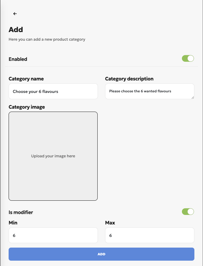 First we need to create the category that will contain our extras, in this example we will do the setup for a box of macarons where we have to give the options for the flavours. In the dashboard create a new category as follows: