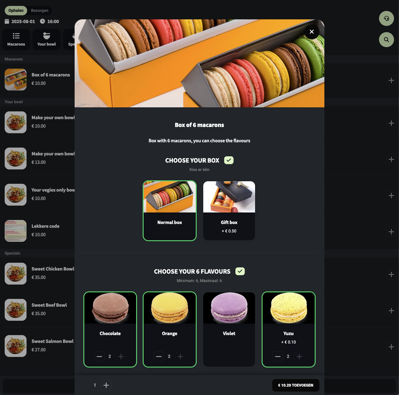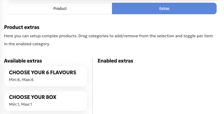 A complex product is a product that has certain selectable modifiers or extras. Some examples are 'Build your own pizza or pokebowl', Box of 6 donuts and select the kind of donuts, or even more simply do you want your bread to be cut or not.