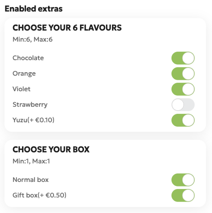 If you want to add another option to select , for example: normal box or gift box You can add a new category 'Choose your box'(min 1, max 1) with the products "Normal box" and "Gift box(+€0.50)"