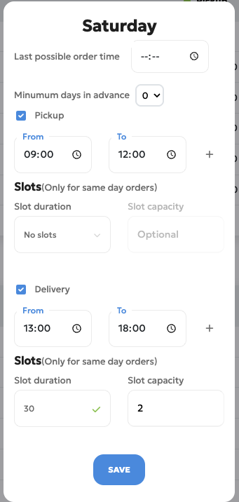 Last Possible Order Time: Sets the cutoff time for placing an order on a given day. For example, if set to 17:00 on Monday, any orders placed after this time will default to the next available day (e.g., Tuesday or Wednesday, depending on your "same day" settings).
