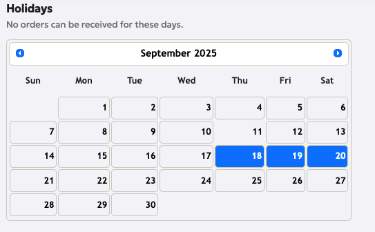 Use this calendar to mark specific days as holidays. When a day is marked as a holiday, customers will be unable to place orders for that date.
