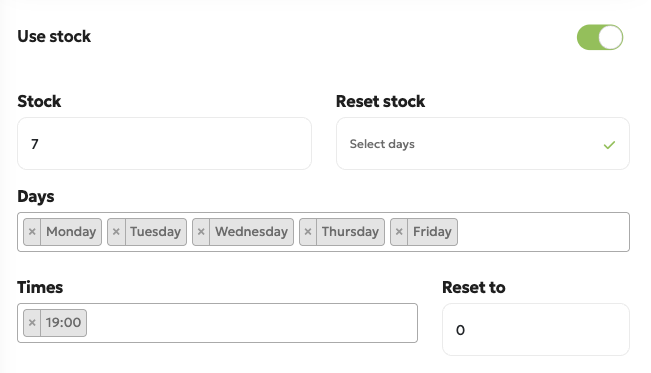 Stock Reset: Configure the stock to automatically reset to a specific value on a daily basis or on selected days at a chosen time (e.g., reset stock to 0 every weekday at 19:00).
