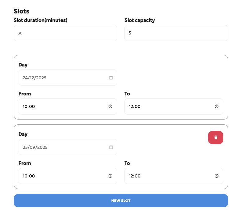 Pickup Moments: Define the available days and times for customers to pick up their orders. The system will automatically calculate the slot duration and capacity for the days you set.