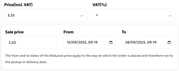 The sale price is based on the date of the order, not the pickup or delivery date. When a product has an active sale price, it will be displayed prominently in the product catalog.